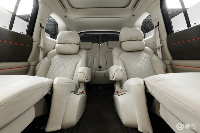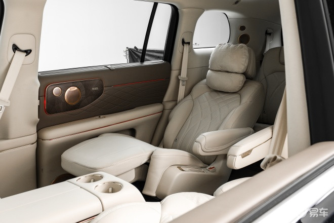 智己LS9采用2+2+2的六座布局,后排配备了21.5英寸车顶娱乐屏,第二排配备了独立座椅,并且还加入了腿托,座椅支持通风、加热以及按摩功能。值得一提的是,第二排座椅还可放平,进一步提升了内部乘坐空间。