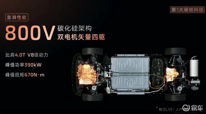 动力方面,新车搭载智己“恒星”超级增程系统,该系统由1.5T发动机与电动机组合而成,最大综合功率390千瓦,综合扭矩670N·m,并搭配52kWh和66kWh两种容量的电池组,CLTC最大纯电续航402公里,综合续航可达1508公里。新车全系标配800V碳化硅平台,零百加速成绩达到4秒级。