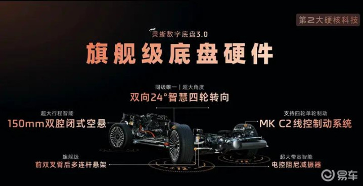 智己LS9搭载灵蜥数字底盘3.0,采用150mm双腔闭式智慧空气悬架和灵蜥智能控制中枢,具备双向24°智慧四轮转向能力,转弯半径只有4.95m。此外,智己LS9还搭载MKC2线控制动系统,实现100%制动能量回收,配合灵蜥数字底盘3.0,制动性能更加优秀。